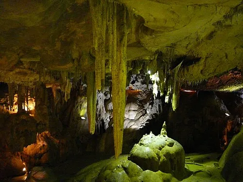 Parcours souterrain spectaculaire entre escaliers, barque et petit train 🚋 Formations calcaires féeriques et ambiance magique.